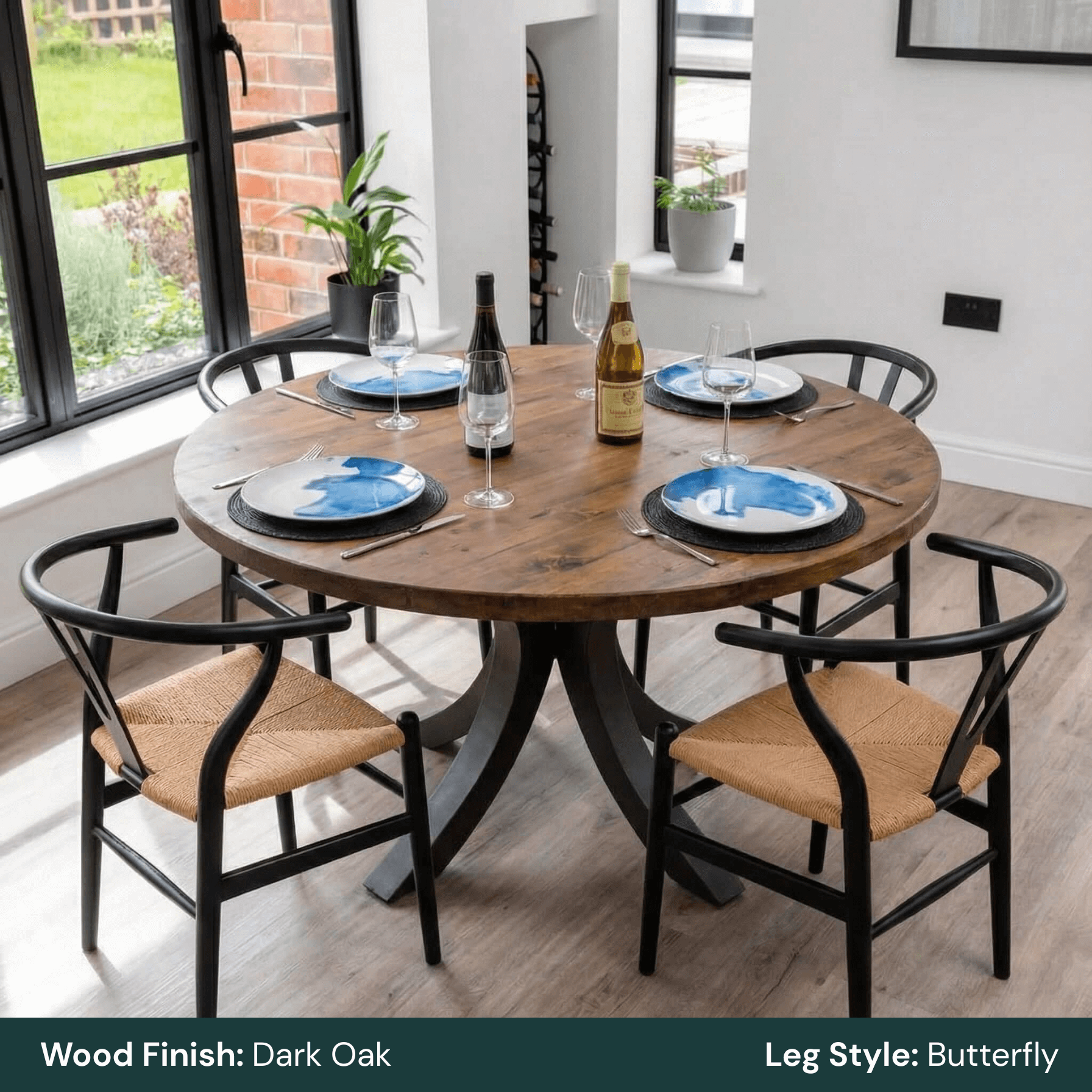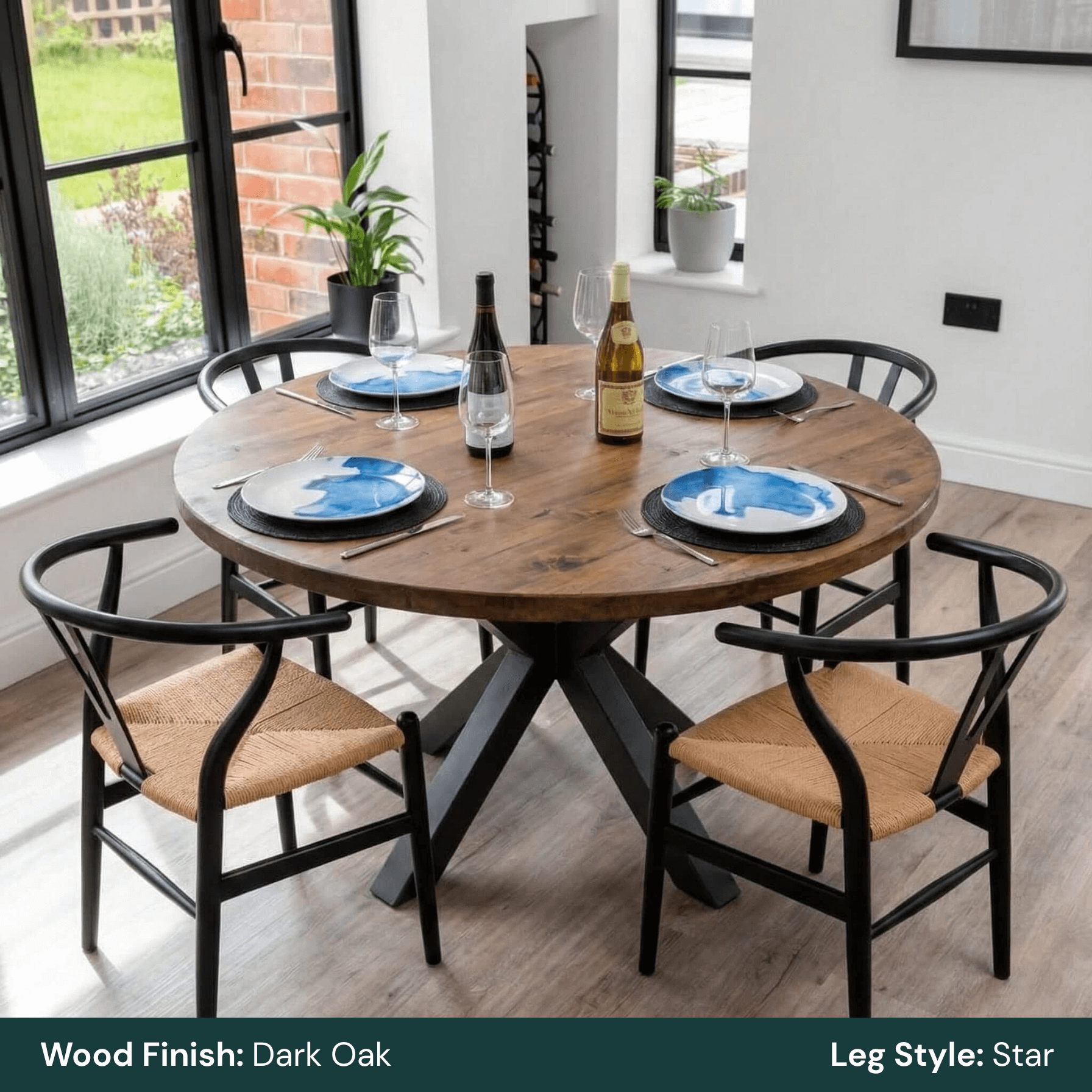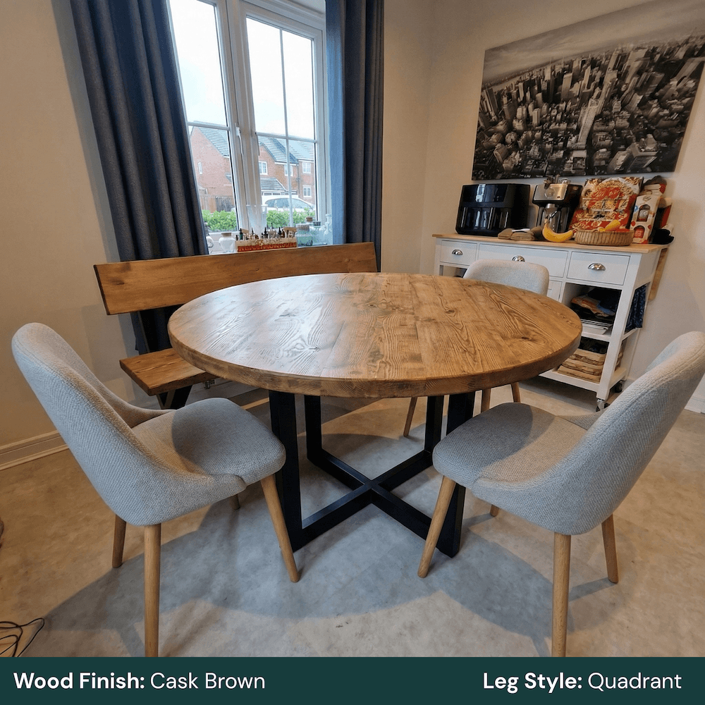This round rustic dining table is designed for everyday use, combining solid timber construction with clean, architectural steel bases. Its circular top encourages easy conversation and flexible seating, making it ideal for both dining rooms and open-plan kitchens.