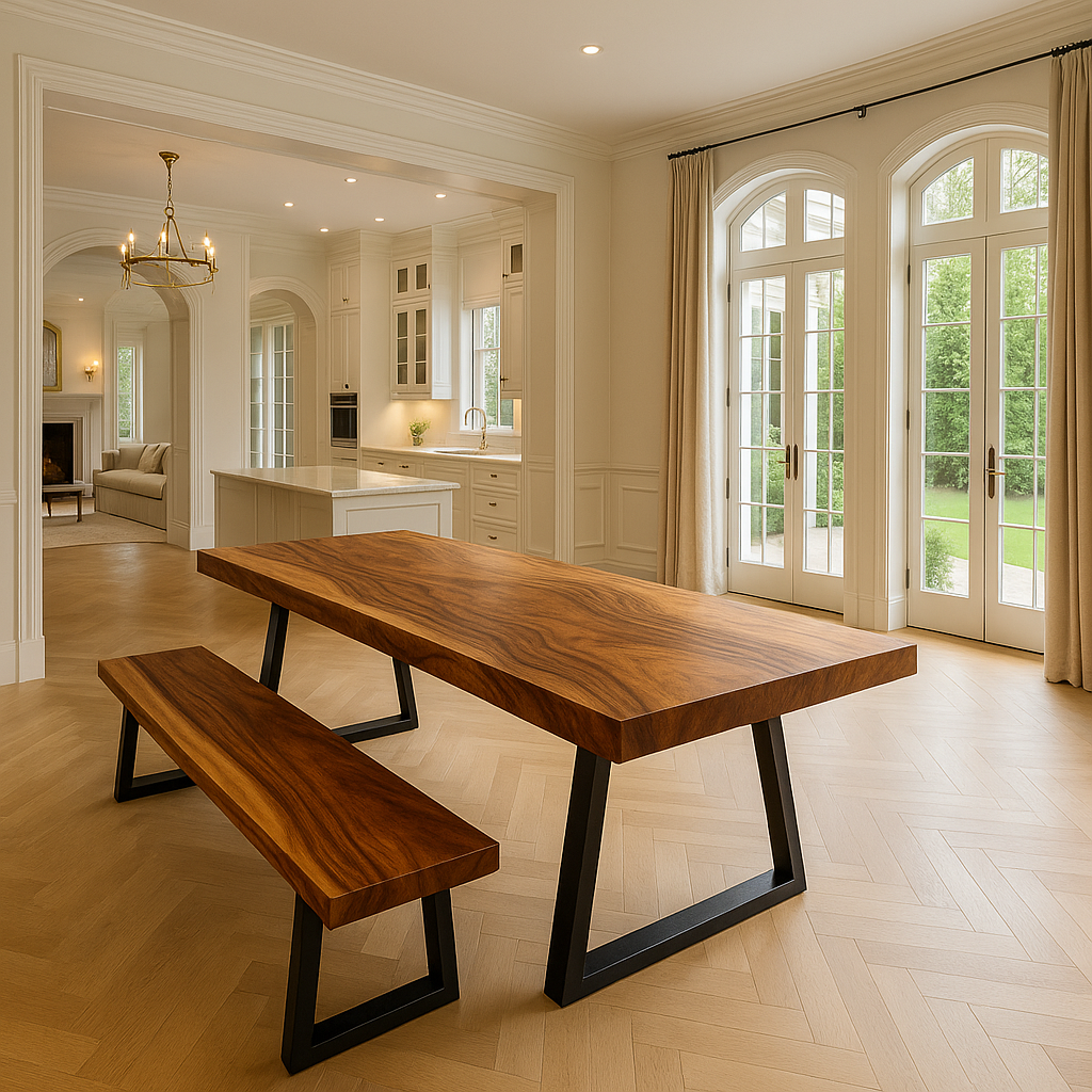 Our Suar Single Slab Dining Tables are each crafted from a single piece of solid Suar wood, meaning no two tables are ever the same. Every slab has its own unique grain pattern, colour variation, and live edge shape.