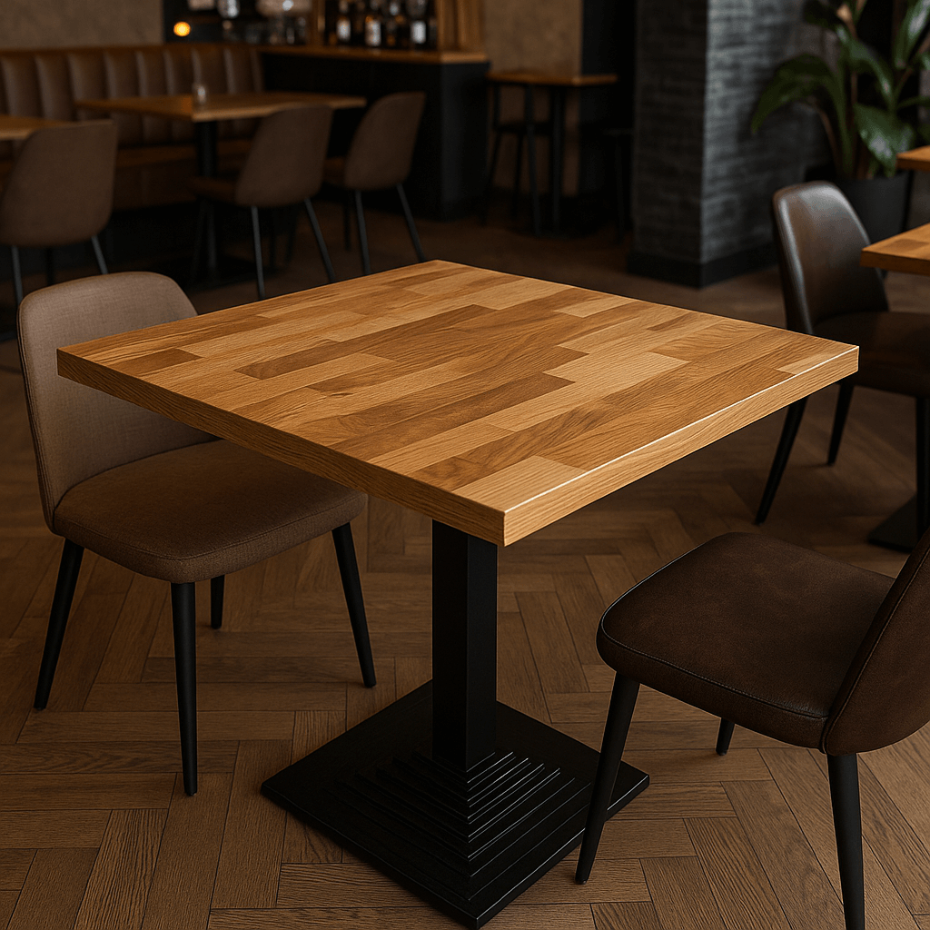 This set of 5 restaurant tables combines solid staved oak tops with durable powder-coated pedestal bases. Each top is lacquered for commercial use, ensuring strength and easy maintenance in busy hospitality settings.