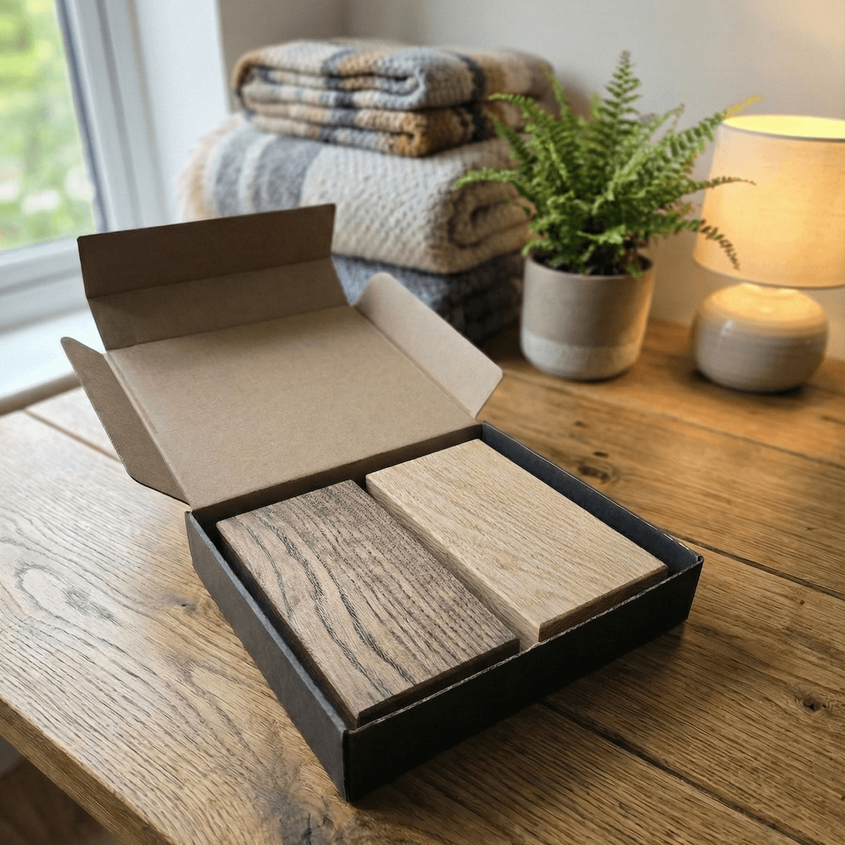 Choosing the right wood finish is an important part of creating your perfect piece, and our sample boxes are designed to make that decision easy and risk-free. Each box contains solid wood samples finished exactly as we use on our furniture, so you can see and feel the quality in your own home before ordering.